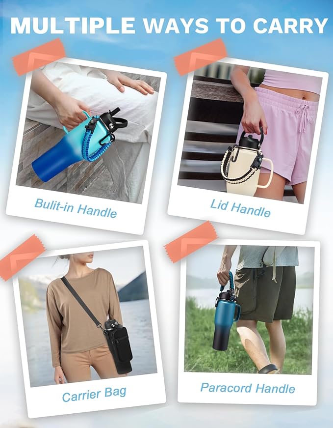 - INSULATED TUMBLER PACKAGE INCLUDE: A 32 oz insulated water bottle with handle, and 8 bottle accessories (1 x auto spout lid, 1 x straw lid, 1 x bottle carrier bag with strap, 1 x paracord handle, 1 x protective boot, 2 x straws, 1 x straw brush), make this insulated cup your best travel companion