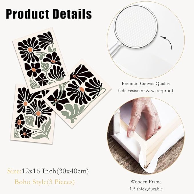 - Boho Wall Art: Elevate your living space with the Boho Wall Art Set, featuring three framed abstract black flower and plant posters. These vintage green floral canvas prints add a touch of neutral, aesthetic charm to any room, perfect for bohemian-themed decor.