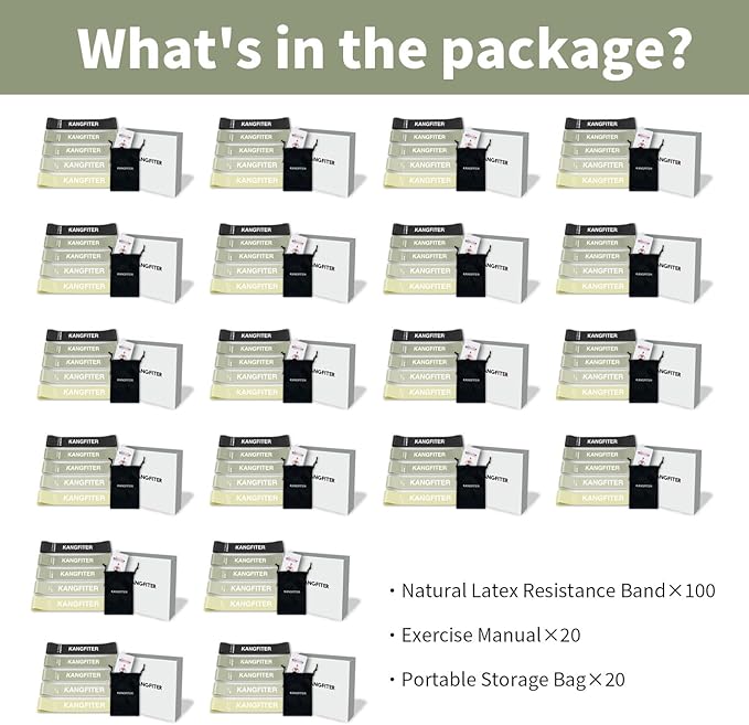 - 【WHAT YOU GET】: 100 Pcs KANGFITER resistance bands,5 pieces each set with storage bag and instruction guide.They can be provided to 20 gym members or class students and are suitable for group fitness exercises both indoors and outdoors.