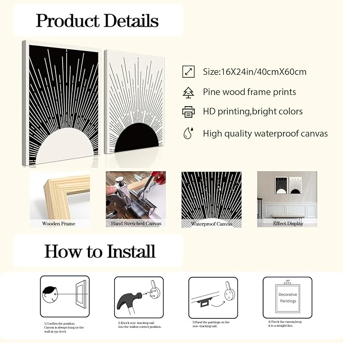 - 1.Framed Wall Art Set:This is a black and white abstract sunrise theme decorative painting, divided into two parts, showing the moment of the sun rising and setting. Through the simple line design, it shows geometric beauty, suitable for matching bohemian style or modern simple home decoration.