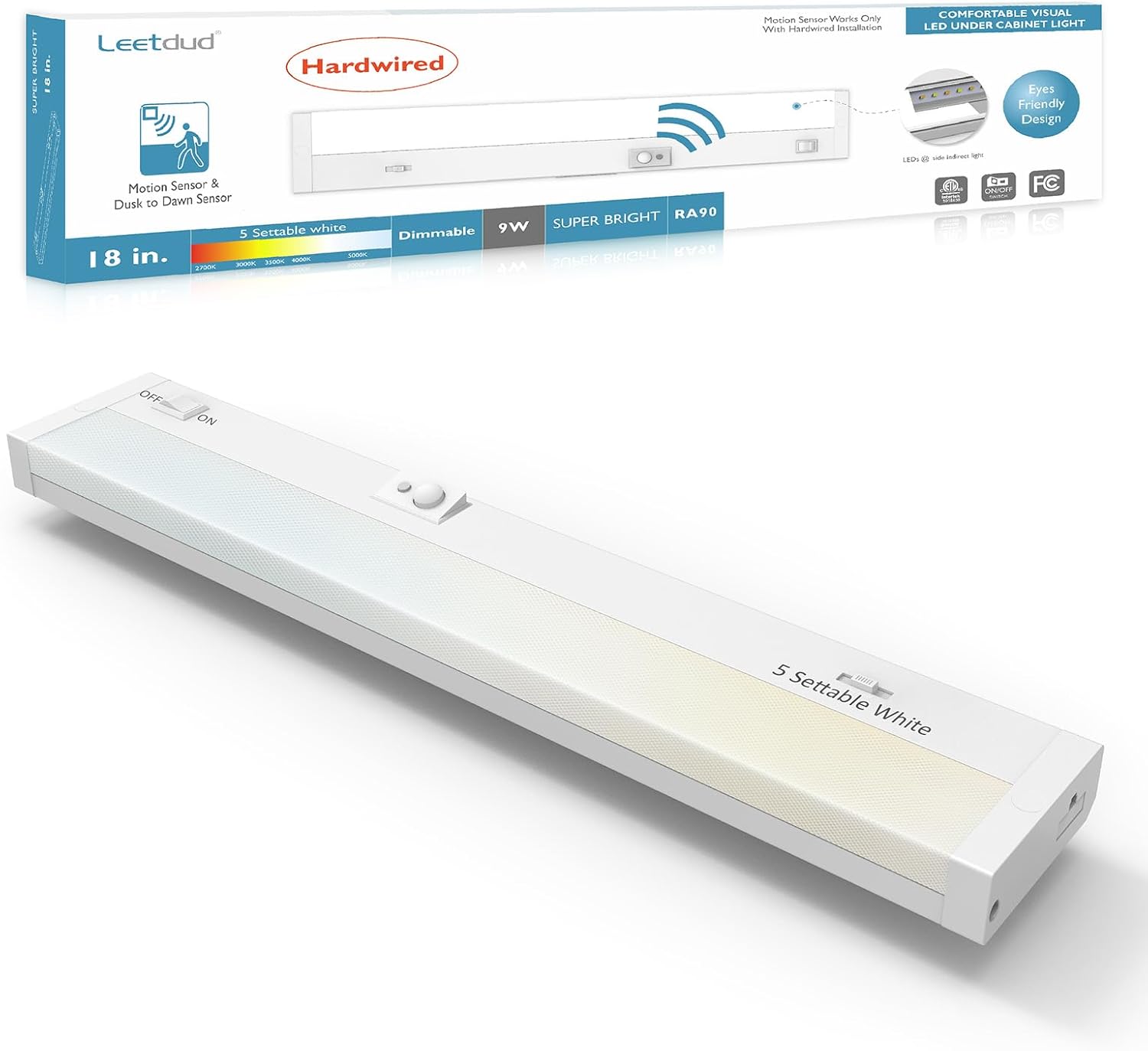 Under Cabinet Lighting Motion Sensor Hardwired, 18 Inch 9W Dimmable, 5 CCT 2700/3000/3500/4000/5000K, Eyes Care Design Linkable Under Counter Lights for Kitchen, Sink, ETL Listed, White