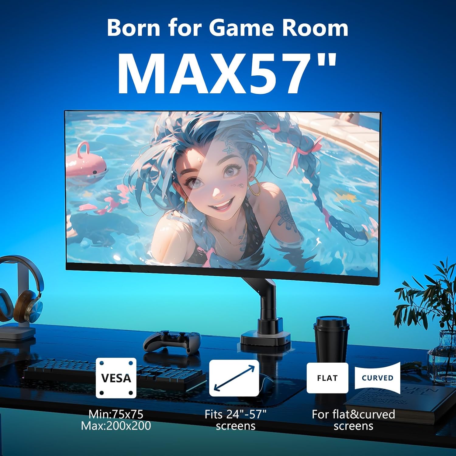 - Universal monitor arm for larger and heavy duty monitors from 24"to 57 ", flat screen up to 59.4lbs and curved screen up to 48.4lbs. Vesa mounting patterns 75*75, 100*100, 200*100, 200*200, compatible with G9 curved gaming monitor