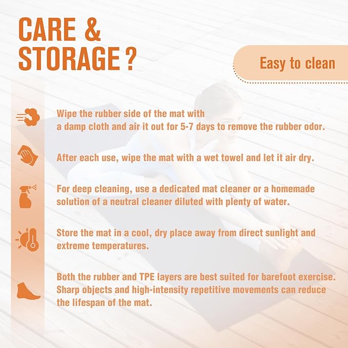 - CARE INSTRUCTION - 1. All natural rubber possesses a harmless odor of rubber. Wipe the surface of the rubber side with a damp cloth and place it in a cool, well-ventilated area for a period of 5-7 days, the odor shall gradually dissipate. 2. Clean the yoga mat by wiping the surface with a wet towel. Let it air dry naturally before storing. And store the yoga mat in a cool, dry place away from direct sunlight and extreme temperatures.