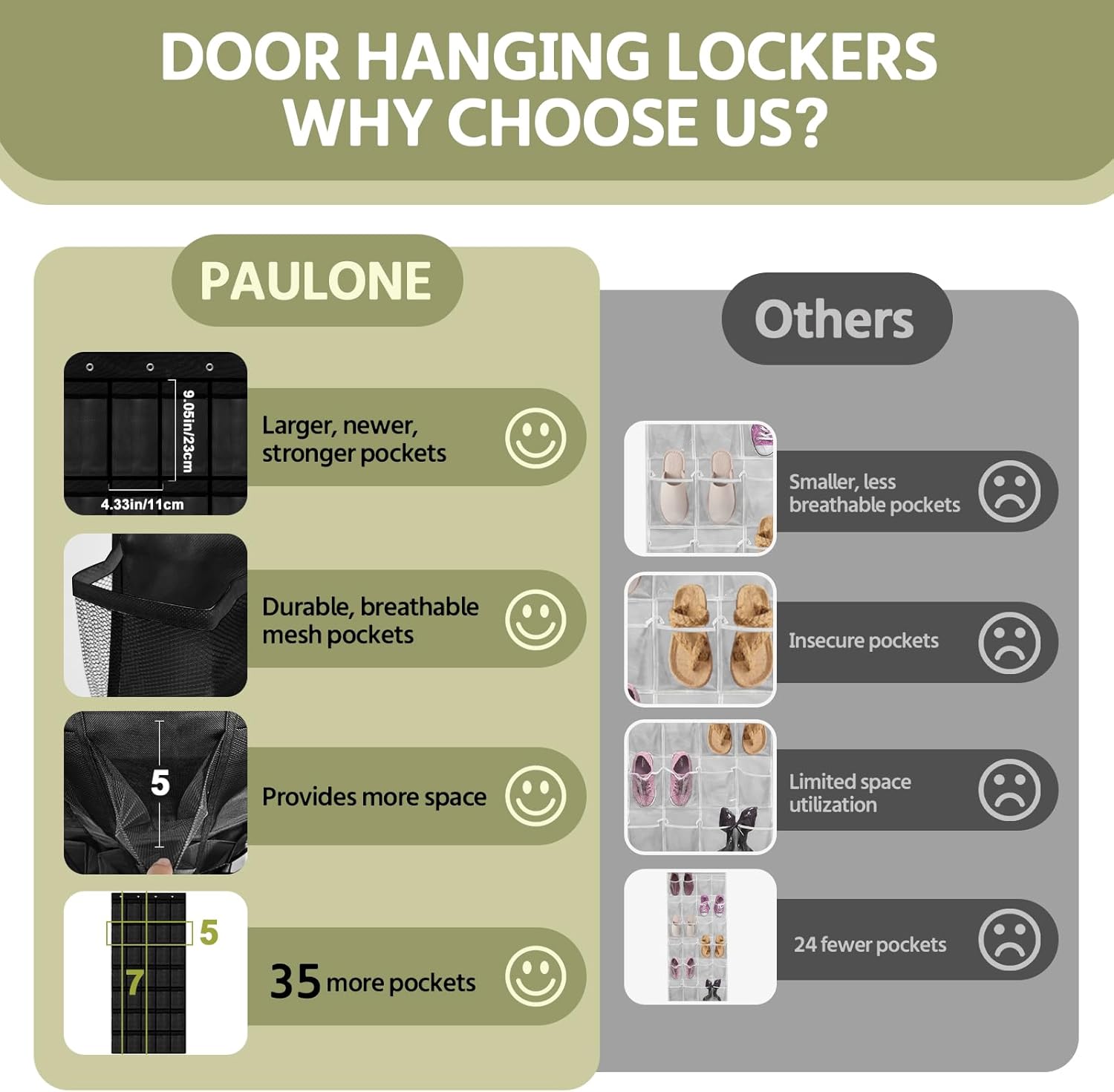 - 🍁✔️【ENLARGED AND BREATHABLE MESH POCKETS SIZE】: The whole hanging shoe rack measures 68.7“(L) x 25.6.”(W), with a total of 35 pockets, each pocket measures 9.05 “H X5.08 ‘W X 6.75 ’D. It's breathable and spacious, quick drying, no need to worry about odor and mold. The large and deep pockets can accommodate men's size 13 shoes, or a pair of children's shoes can also fit into 1 pocket.