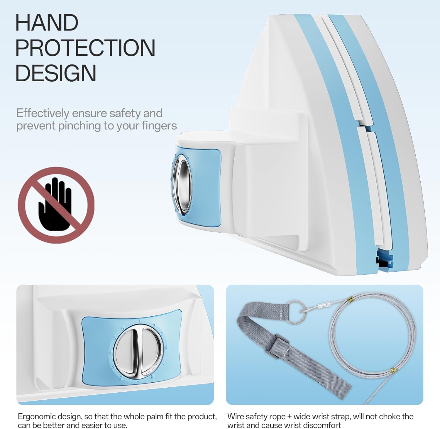 - Safe Window Cleaning with Anti-Pinch Design: The magnets automatically reset to the weakest level when separated, preventing finger injuries from sudden magnetic force. A 2.5m safety rope keeps the cleaner securely attached, letting you confidently clean high-rise windows from indoors.