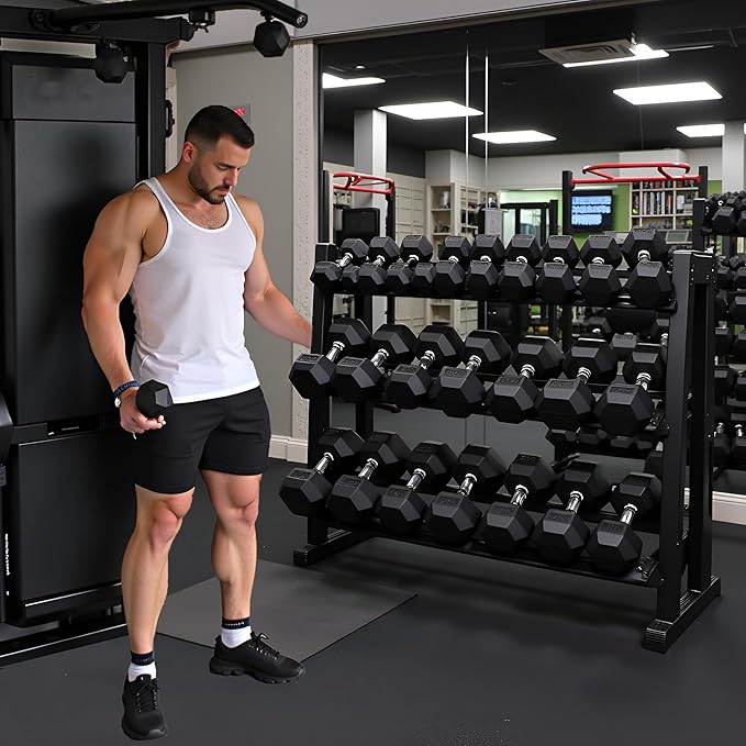 - 3. Convenient and Spacious Dumbbells Rack: The three-layer rack design with hexagon-shaped ends keeps the gyms hex weight set from rolling away and makes them easier to store. With an angled design and anti-slip surface, the rack is spacious and convenient for storing your dumbbell , ensuring that they won't be crowded during use and are easy to pick up.