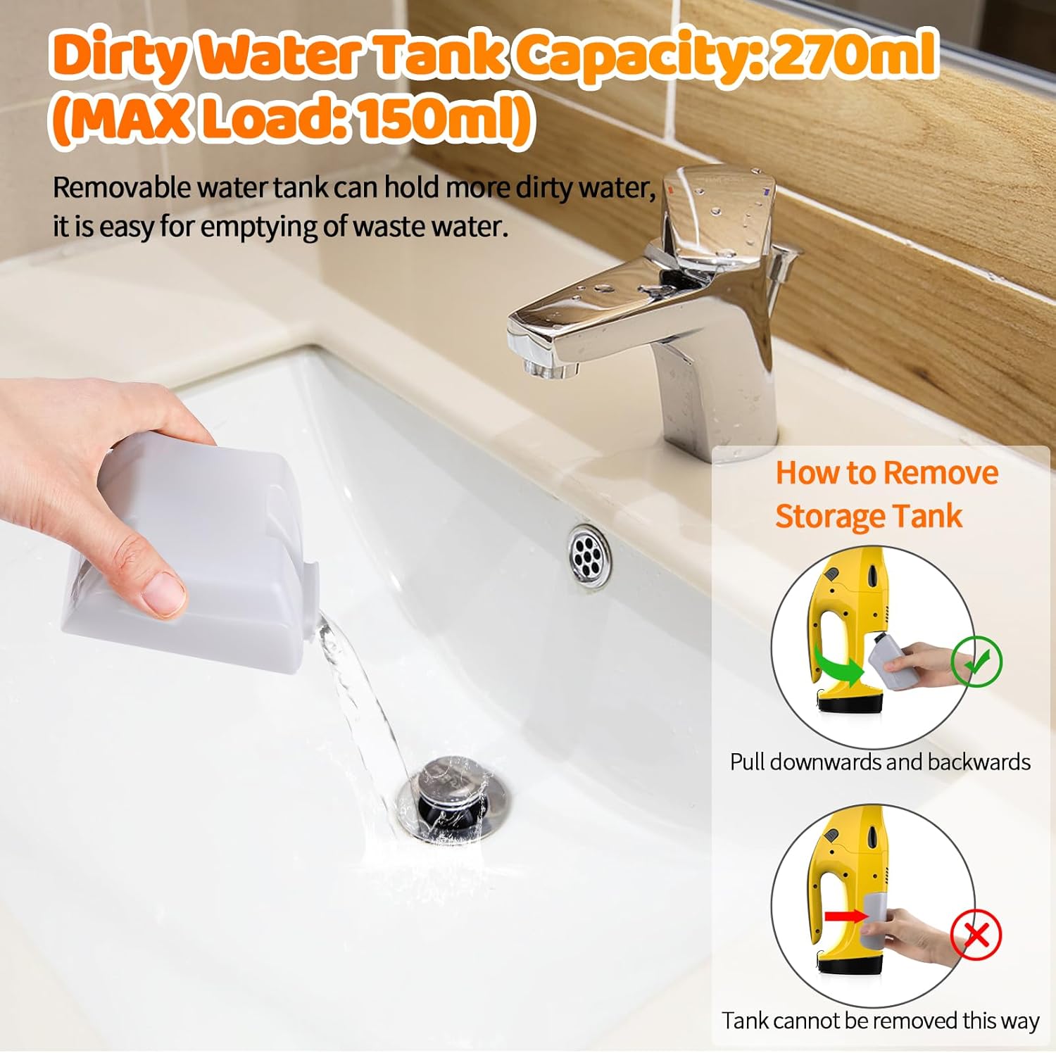 - ๐๐ฑ๐ฌ๐บ๐น ๐๐ฒ๐๐ฎ๐ฐ๐ต๐ฎ๐ฏ๐น๐ฒ ๐ช๐ฎ๐๐ฒ๐ฟ ๐ง๐ฎ๐ป๐ธ: The detachable water tank is easy to empty. Dirty Water Reservoir Capacity: 270ml (MAX Load: 150ml). Tips: The MAX load of the dirty water reservoir is 150ml, please empty it in time to avoid leaking.
