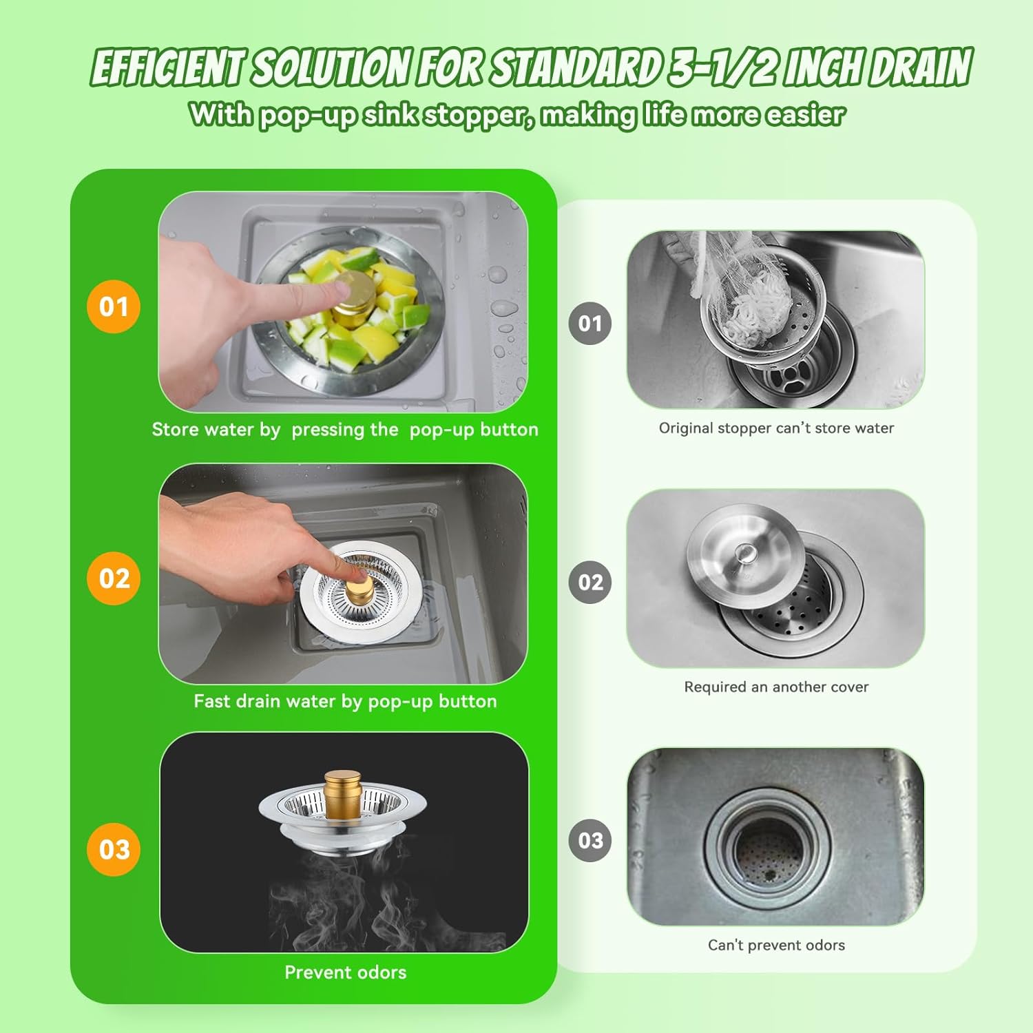 - 3 in 1 Sink Stopper Kitchen Drain: This newly pop-up kitchen sink strainer combines a drain stopper, strainer basket, and fast drainage system into one convenient pop-up button, eliminating the need for a separate sink cover to store water or drainage. With an update sink strainer stopper, you can rest assured that your kitchen is equipped with a reliable tool that minimizes the risk of messes and clogs