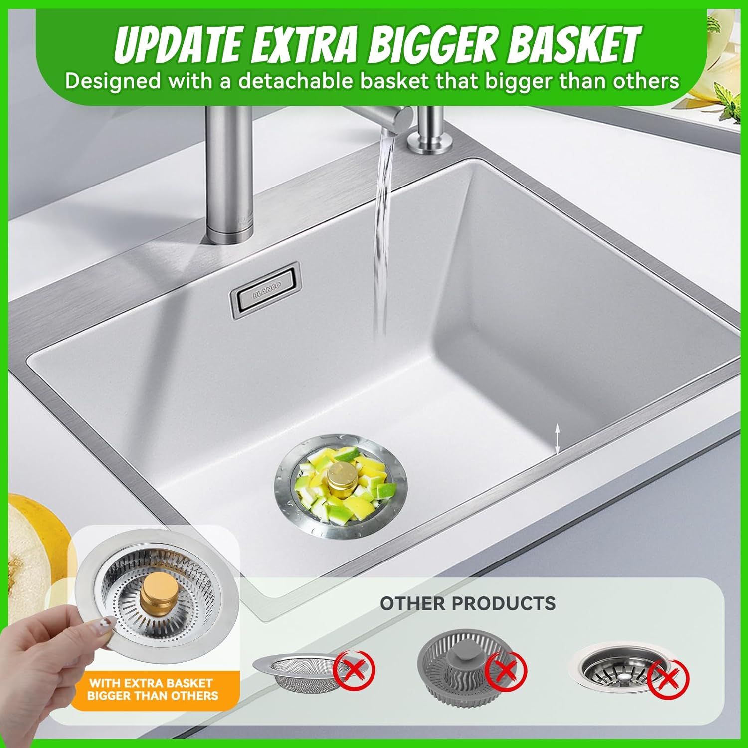 - Upgraded with Larger Kitchen Sink Drain Basket: The pop-up strainer basket is larger than previous models, allowing it to catch more kitchen waste and reducing the frequency of emptying with its adjustable feature.With its increased size, the basket is more effective at catching food waste and debris, helping to prevent clogs in the sink drain. Easy to clean and get food out