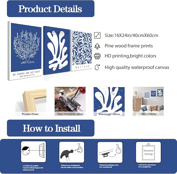 - 【Perfect Size】 Matisse canvas wall art measures 16x24 inch, whether used as a wall art set of 3 above a bed, sofa, or desk, or arranged separately throughout your space, blue pictures wall decor great for building a gallery wall or accenting small spaces with style