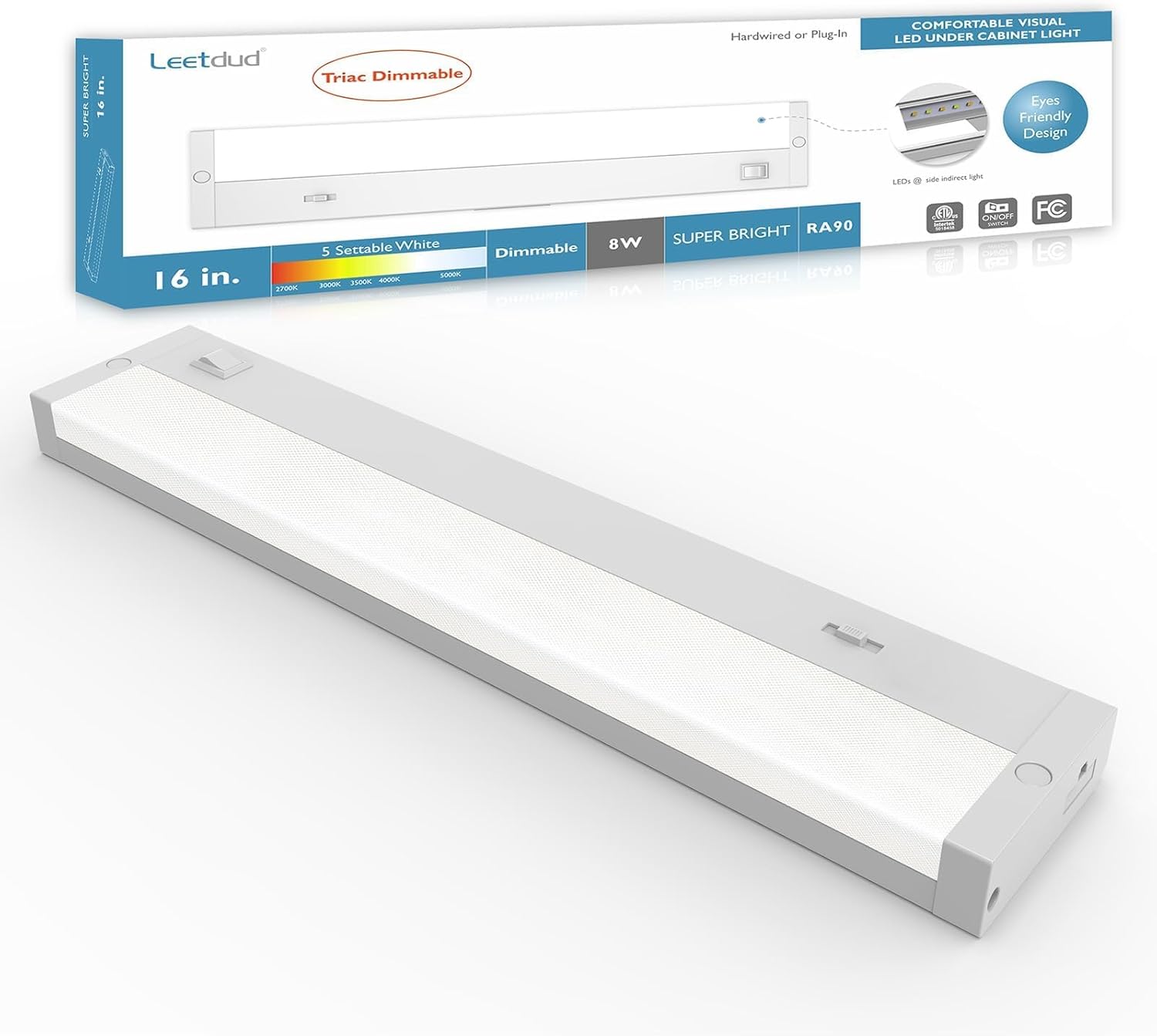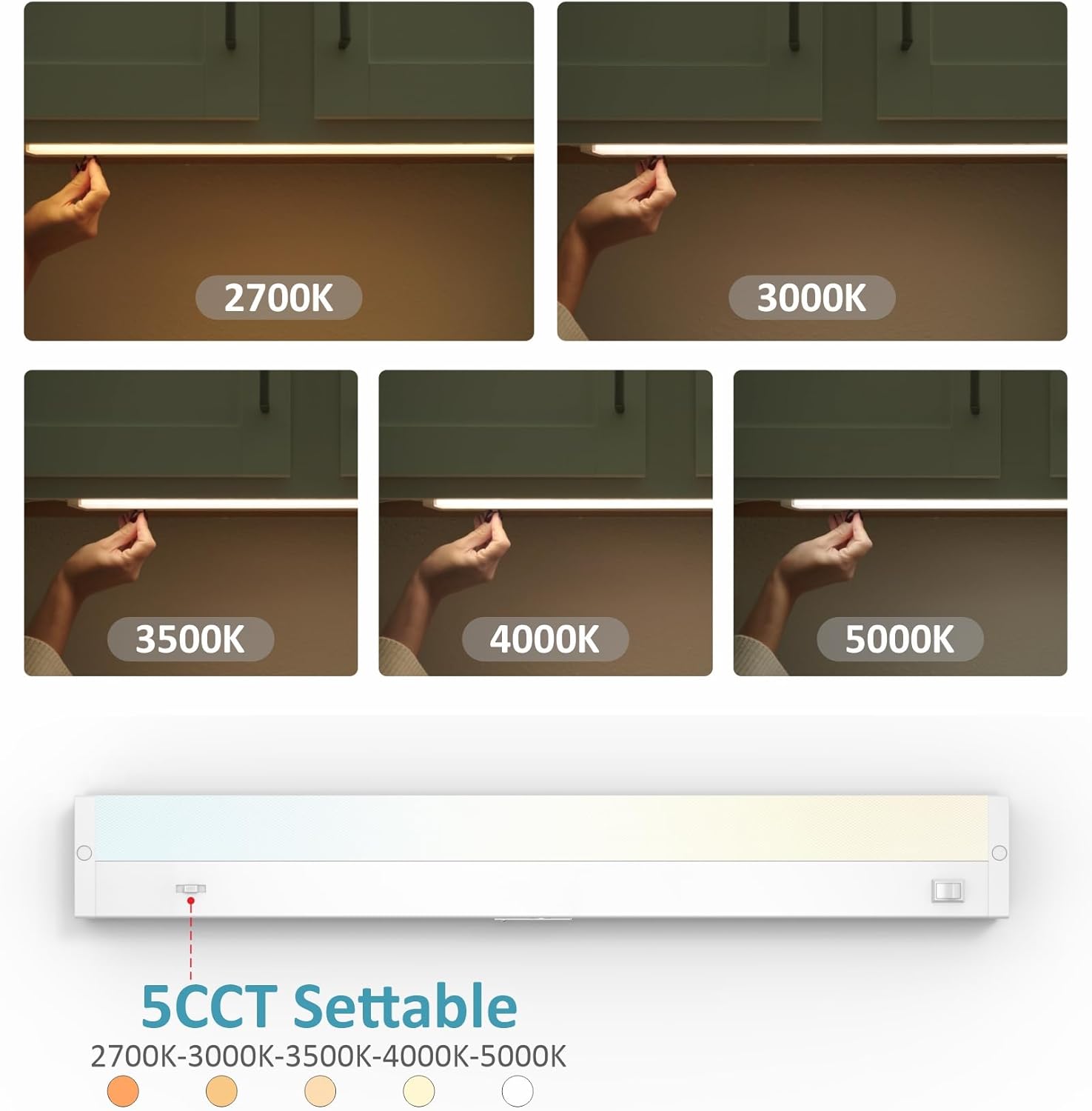 - 5 Color Temperature (CCT) Settable: Choose from Soft White (2700K), Warm White (3000K), Neutral Bright White (3500K), Cool White (4000K), or Daylight (5000K) with an On/Off switch, ideal for under cabinet lighting, counter light