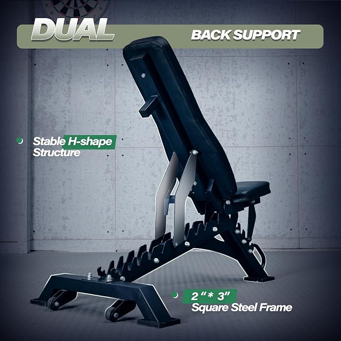 - 1300LBS Weight Capacity: Designed with a unique triangular frame and dual-track backrest support, this weight bench handles up to 1300 lbs, providing maximum stability and safety during intense weight lifting sessions.