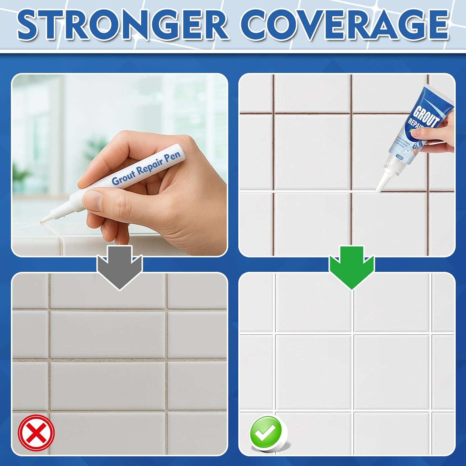- More Coverage than Grout Pen: Our tile grout repair kit uses a new upgraded filling formula, which can be transformed into a real mortar grout after drying, which can cover stains better than Grout Pen and keep it clean longer. Make your floor look brand new.