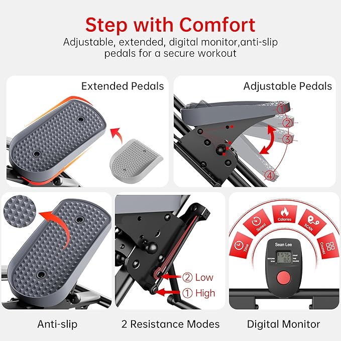 - REAL-TIME DATA TRACKING - The seanleecore stepper's LCD monitor provides real-time tracking of four key data: steps, calories, time, speed, and scan. You can easily record and view your workout progress.