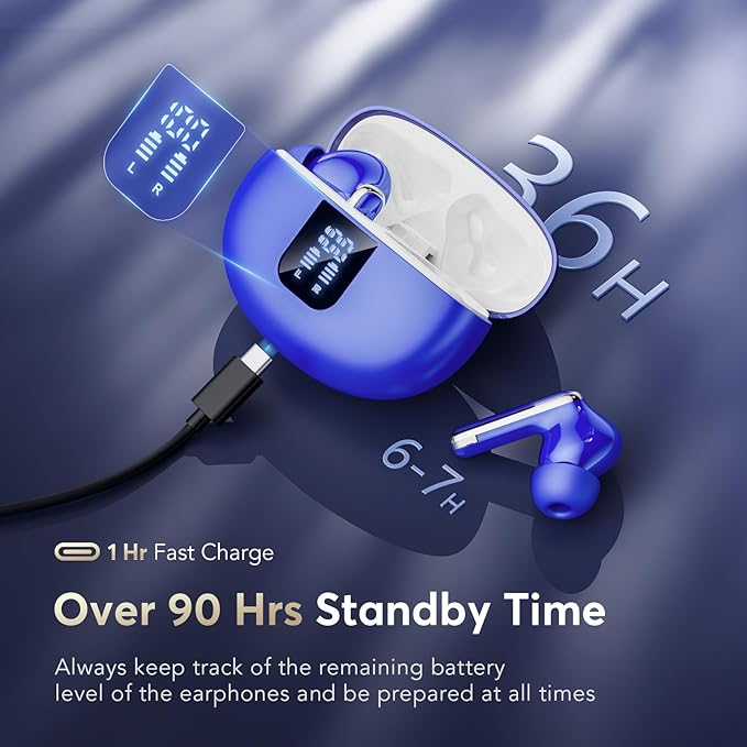 - 36-Hour Playtime, Non-Stop Entertainment: Our Bluetooth earbuds deliver an impressive 6-7 hours of continuous playtime on a single charge, ensuring your music or calls accompany you throughout the day. With the sleek charging case, extend your listening experience to a total of 36 hours! Need a quick power-up? Just 1 hour of charging fully restores the earbuds, getting you back to your groove in no time. Perfect for long trips, workouts, or daily commutes.