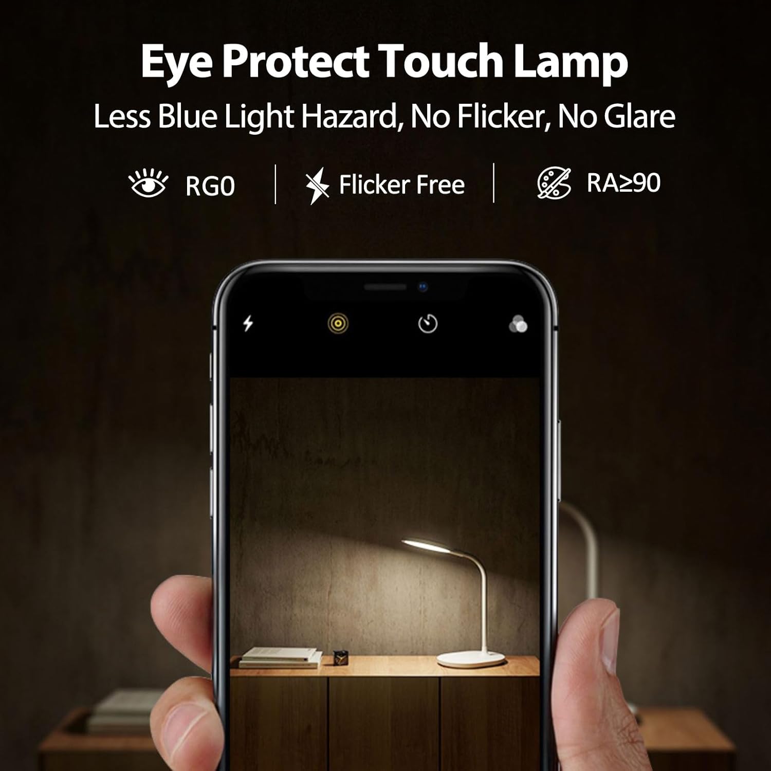 - [ RA≥90, RG0 Eye Protect Touch Lamp ] This desk light has passed the blue light hazard test, reaching RGO exemption level, alleviating eye strain and providing a comfortable lighting experience for you. Less blue light hazard, no flicker, no glare. RA≥90, The higher the CRI, the more realistic the color, give children a vivid and colorful childhood.