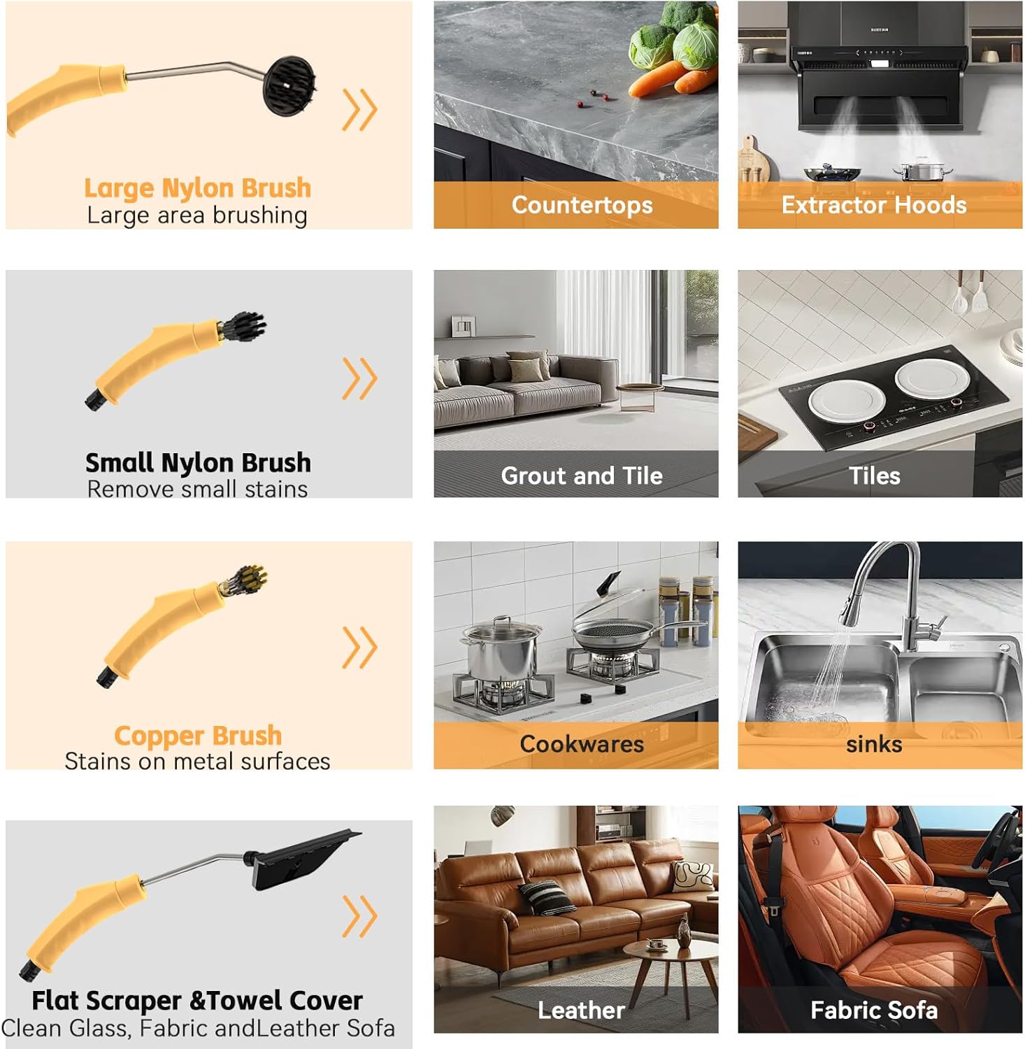 - 【Bonus Glove & Funnel Cleaning Kit Included】 Package includes: 1× Steam cleaner with tank, 1× 1.5m (78.74") Steam hose, 1× 2.2m (86.6") Power cord, 2× Extension rod tubes, 2× Brass brushes, 2× Nylon brushes, 1× Large round plastic brush, 2× Multi-purpose adapters (1 Brass & 1 Plastic) 2× Cleaning cloth sleeves, 1× Window scraper, 3× Waterproof rings, , 2× Heatproof gloves, 1× Collapsible silicone funnel, 1× Microfiber cloth, and 1× User manual—everything you need for professional-level steam cleanin