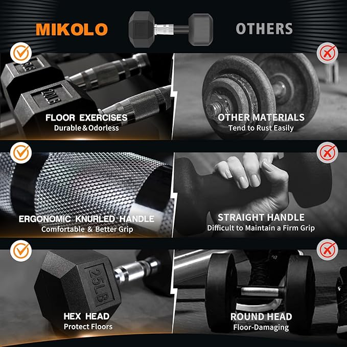 - [STURDY AND DURABLE] The hexagonal rubber-encased head design effectively prevents the dumbbell from rolling and makes storage more convenient. High-quality solid cast dumbbells are wrapped in rubber, not only able to withstand intense workouts but also protect the floor from damage, resist rust and wear, ensuring that the dumbbells maintain their durable performance for years of use.