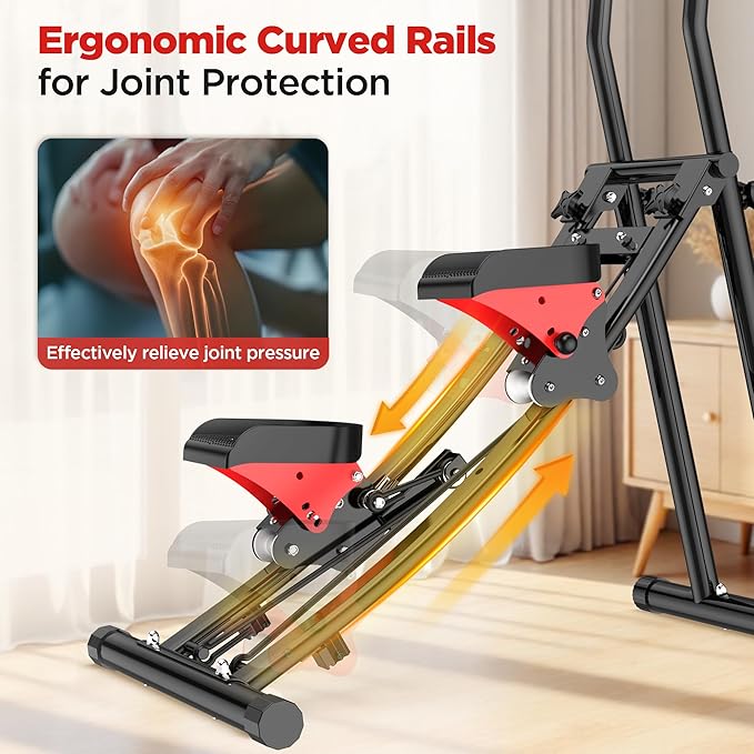 - Ergonomic Curved Rails: The stepper machine features ergonomic curved guide rails and a scientifically optimized stride, designed to maximize muscle engagement while effectively relieving joint pressure to provide a better protection.