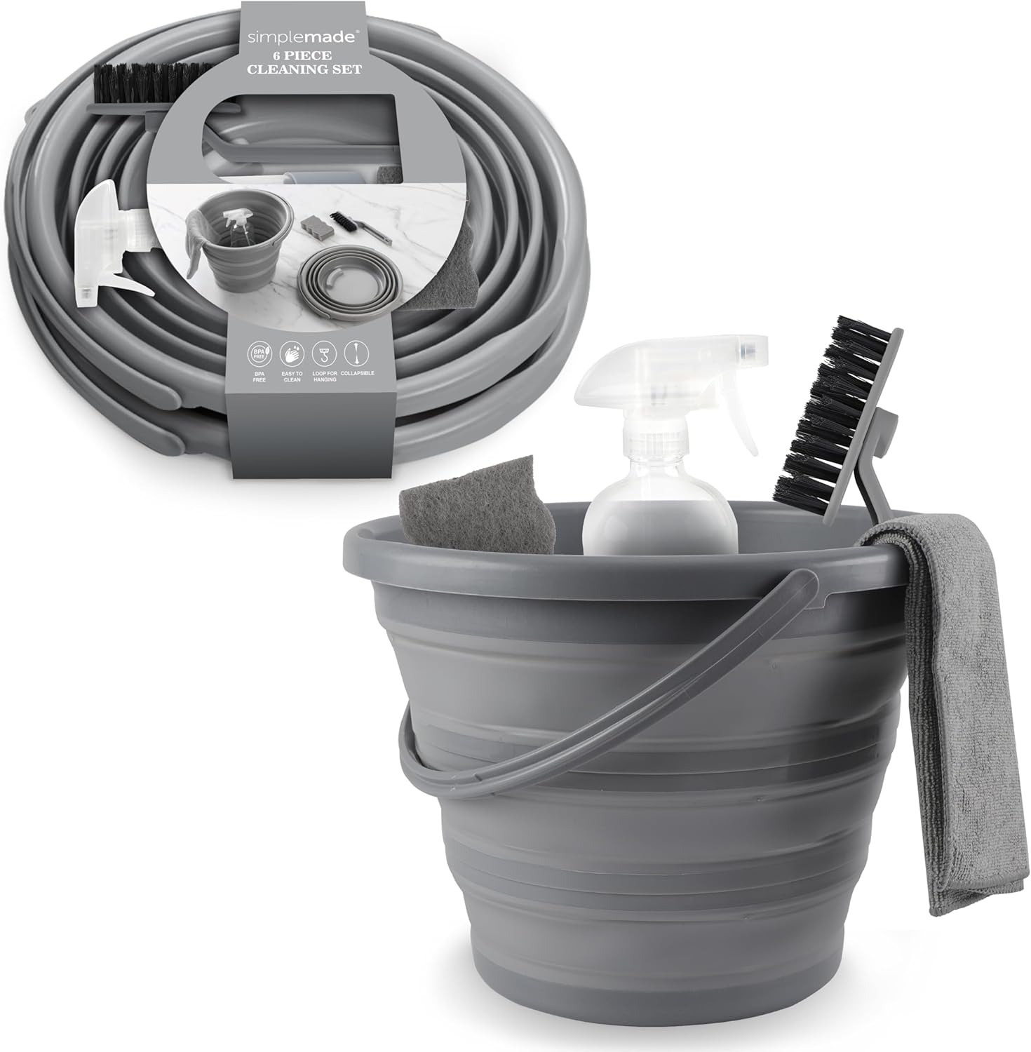 - Ultimate Cleaning Set: Our 6 pc cleaning buckets for household use include a collapsible mop bucket, spray bottle, rag, scrubbing brush, and sponge. Perfect for every room, this set will make chores a breeze.
