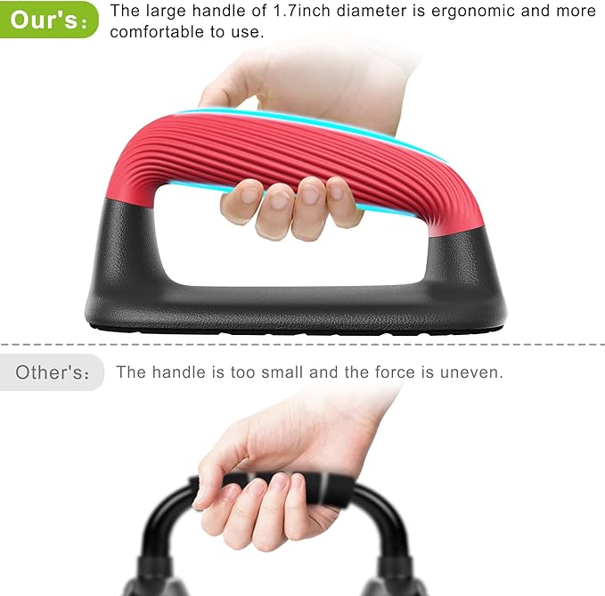 - Comfortable Handle: The handles of push-ups are made of high-quality soft plastic, protect your hands, itโs not easy to get calluses. The diameter is 1 3/5 inches, and the grip is comfortable and ergonomic