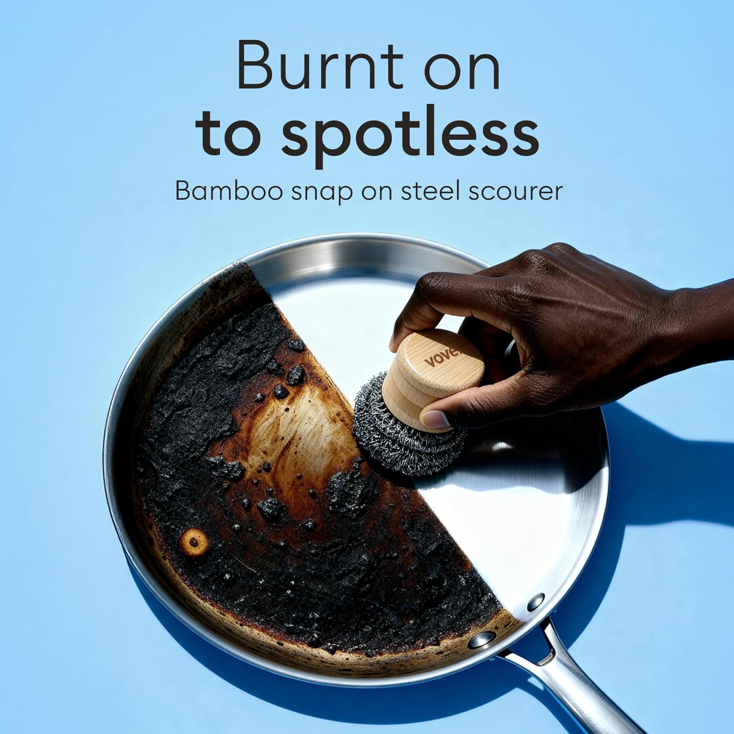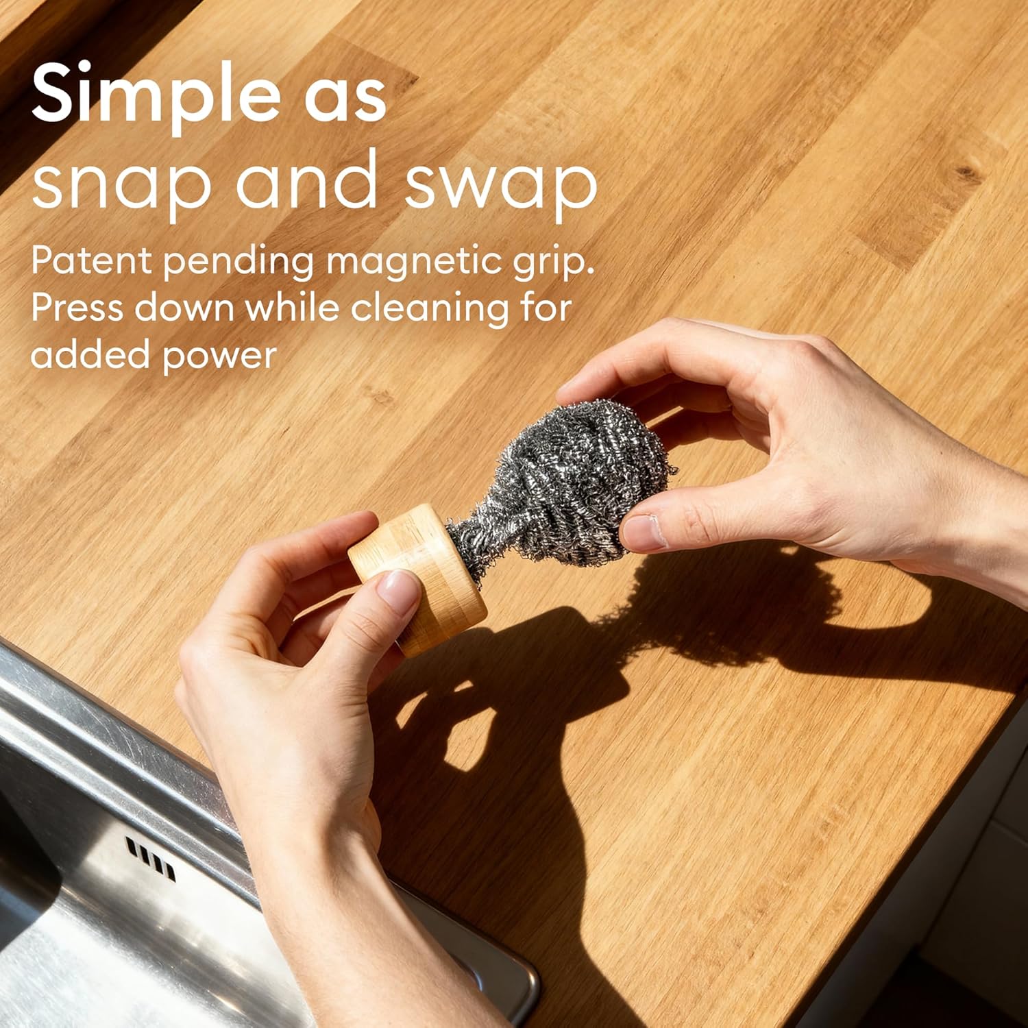 Vove Magnetic Scourer, Stainless Steel Scrubber with FSC-Certified Bamboo Handle, 3 Replacement Pads, Neodymium Magnet, for Cast Iron, Pots & Pans, Griddles, Grills, Plastic-Free Eco-Friendly Cleaner