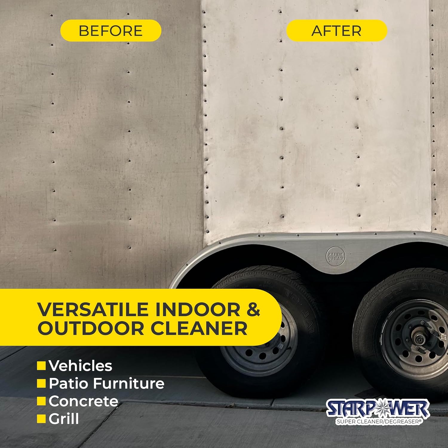 - VERSATILE INDOOR & OUTDOOR CLEANER: Whether it’s floors, sinks, car engines, kitchen appliances, or patio furniture, STARPOWER’s heavy duty concentrate replaces an arsenal of cleaning products while delivering powerful results you can see