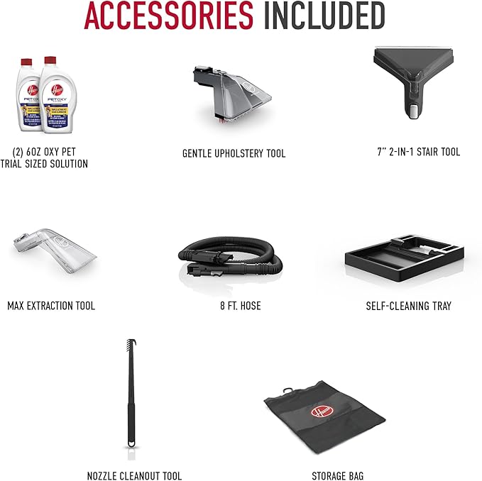 - WHATβS INCLUDED: 7β 2-in-1 Stair Tool, Gentle Upholstery Tool, Max Extraction Tool, Nozzle Cleanout Tool, 8-foot hose, self-cleaning tray, (2) trial sized solutions and storage bag