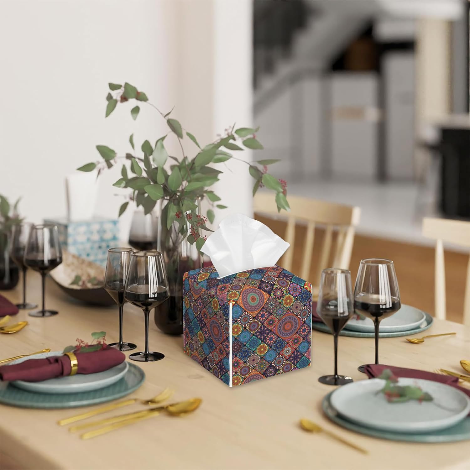 Tissue Box Cover Square, Boho Mandala Floral Morocco Tiles Leather Tissue Box Cover Decorative Facial Paper Organizer Dispenser for Bathroom Kitchen Bedroom Vanity Countertop Night Stands
