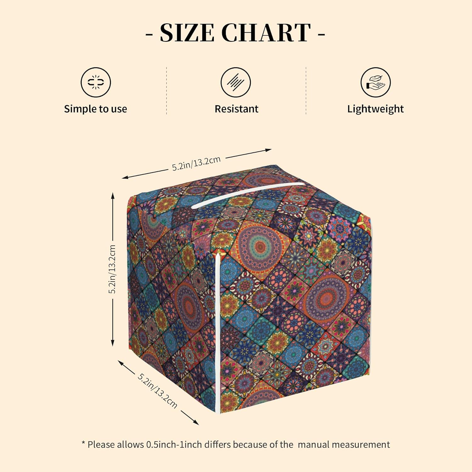 - Universal Size:Tissue box cover measures 5.2"L x 5.2"W x 5.2"H,Accommodates most standard square paper towels on the market