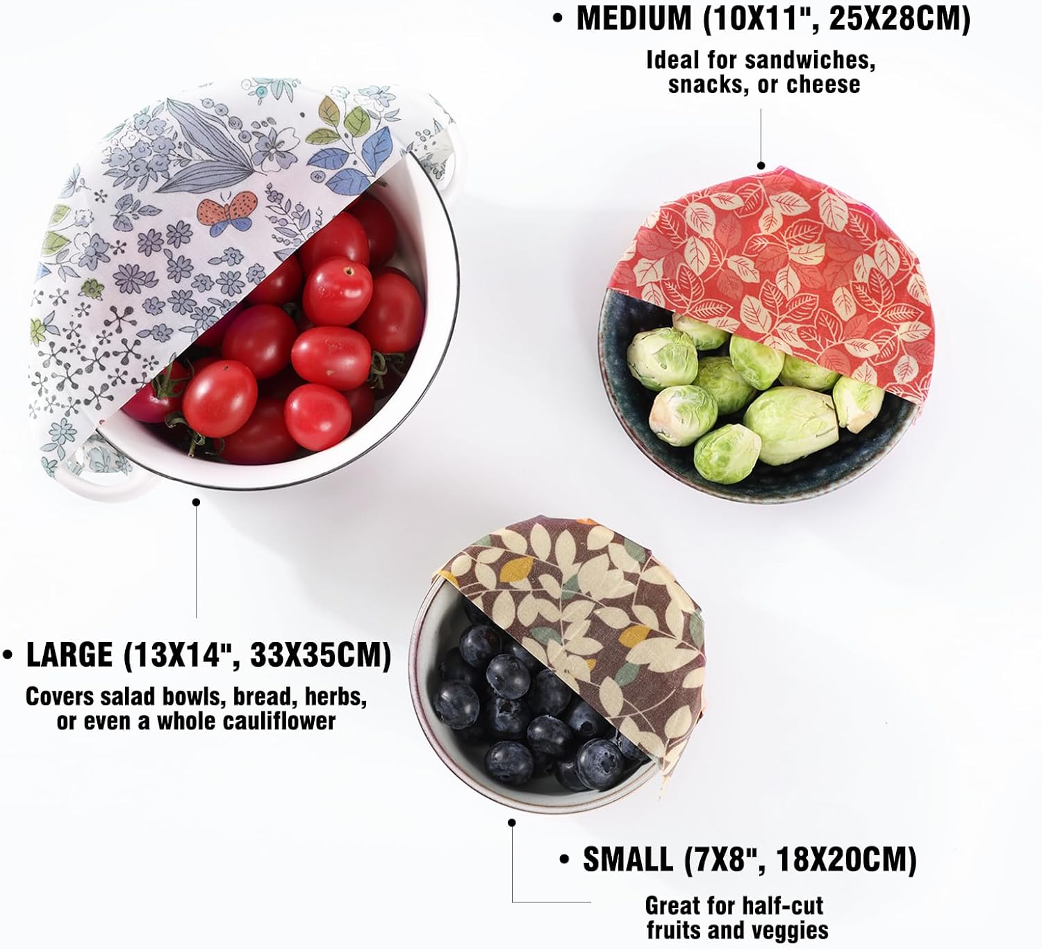 - π Versatile 3-Pack Sizes (S, M, L): Includes Small (7βx8β), Medium (10βx11β), and Large (13βx14β) wraps. Ideal for wrapping homemade bread, sandwiches, cheese, fruits, leftovers, and covering bowls. Perfect for home, school lunches, picnics, or on-the-go food preservation.