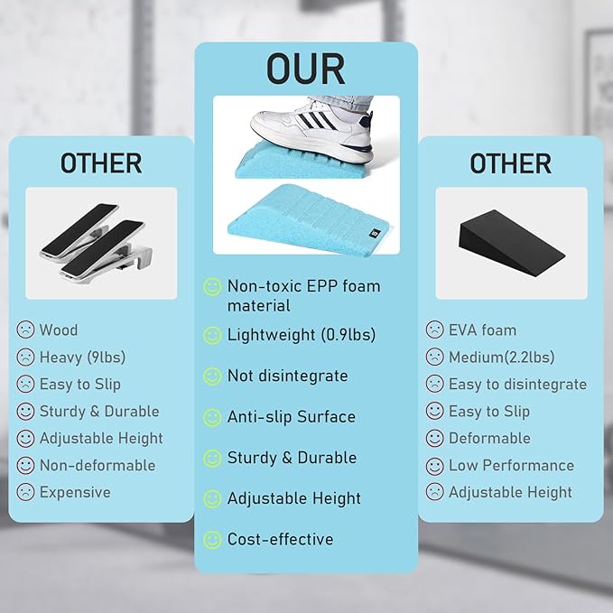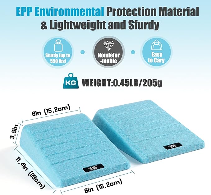 - 【Best Material & Universality & Portability】 - Recyclable, Lightweight, And Sturdy Epp Is More Suitable For Achilles Tendon Stretchers Than Wood Or Metal. It Enables You To Use The Physical Therapy Wedge Kit For Squats, Strengthening Stretches, And Weightlifting To More Effectively Target Muscles. The Use Of Calf Extension Wedges Is Equally Effective For Beginners, Advanced Athletes, And Those Undergoing Physical Therapy. This Lightweight And Compact Set Is A Portable Squat Board That You Can Use At Home, In The Gym, Or Even Outdoors.
