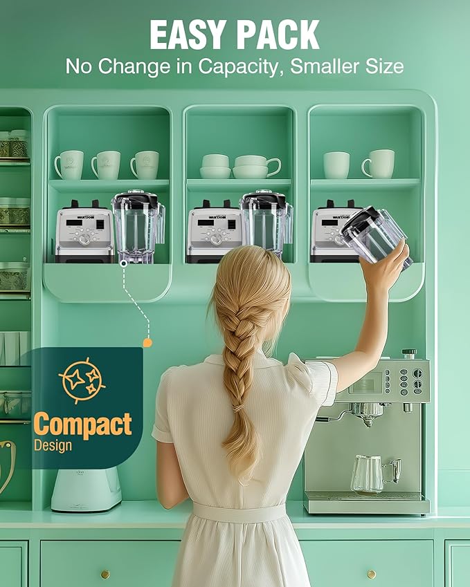 - COMPACT 68OZ PITCHER: Our 68oz (2L) pitcher features a shorter and more compact design that fits easily under kitchen cabinets and takes up less countertop space. Despite its reduced height, it still delivers full capacity—perfect for preparing up to 8 servings of juice or smoothies at once