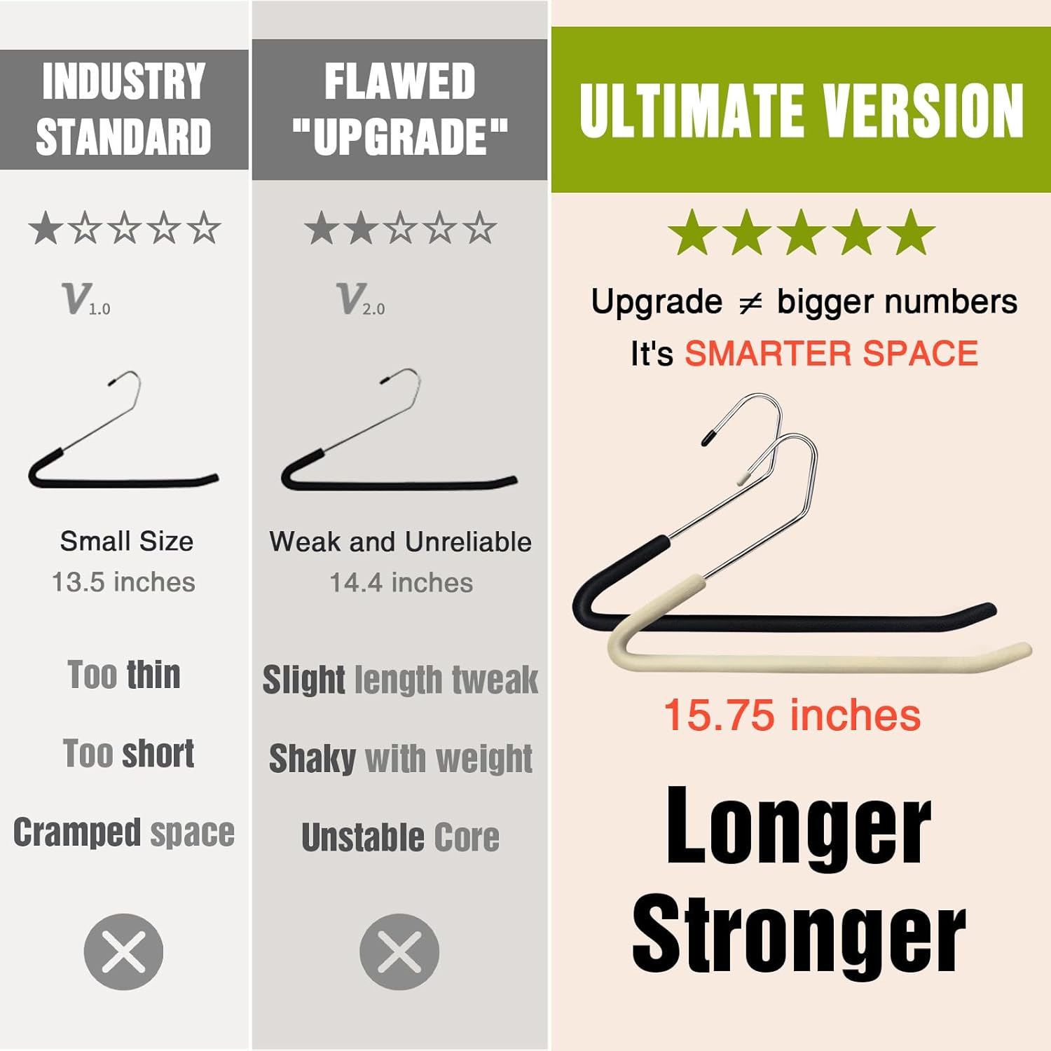 - 【Enhanced Dimension】Our upgraded pant hanger now features an extended length of 15.75" (previously 13.6"), offering a universal solution for all leg sizes. This optimized design ensures maximum compatibility with various pant styles.