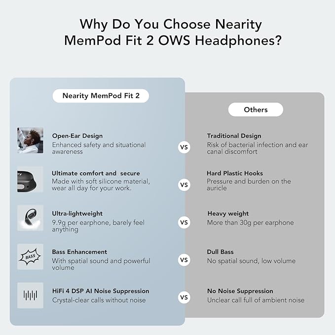 - Environmental Awareness: Whether outdoors, in the office, or at home, the MemPod Fit 2 open ear earbuds provide premium sound quality while allowing you to remain aware of your surroundings. This means you can hear surrounding traffic while walking or easily perceive colleagues' conversations in the office, provides a level of security.