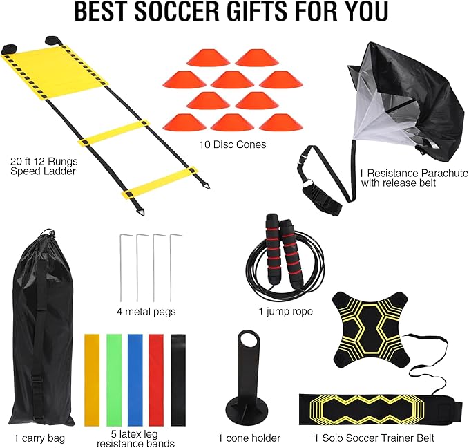 - Agility Training Equipment Kit:20 ft 12 Rungs Speed Ladder, 10 Disc Cones, 1 Resistance Parachute with release belt, 5 latex leg resistance bands, 1 jump rope, 1 cone holder, 1 Solo Soccer Trainer Belt, 4 metal pegs, 1 carry bag. Rich variety of sets suitable for people of all ages.