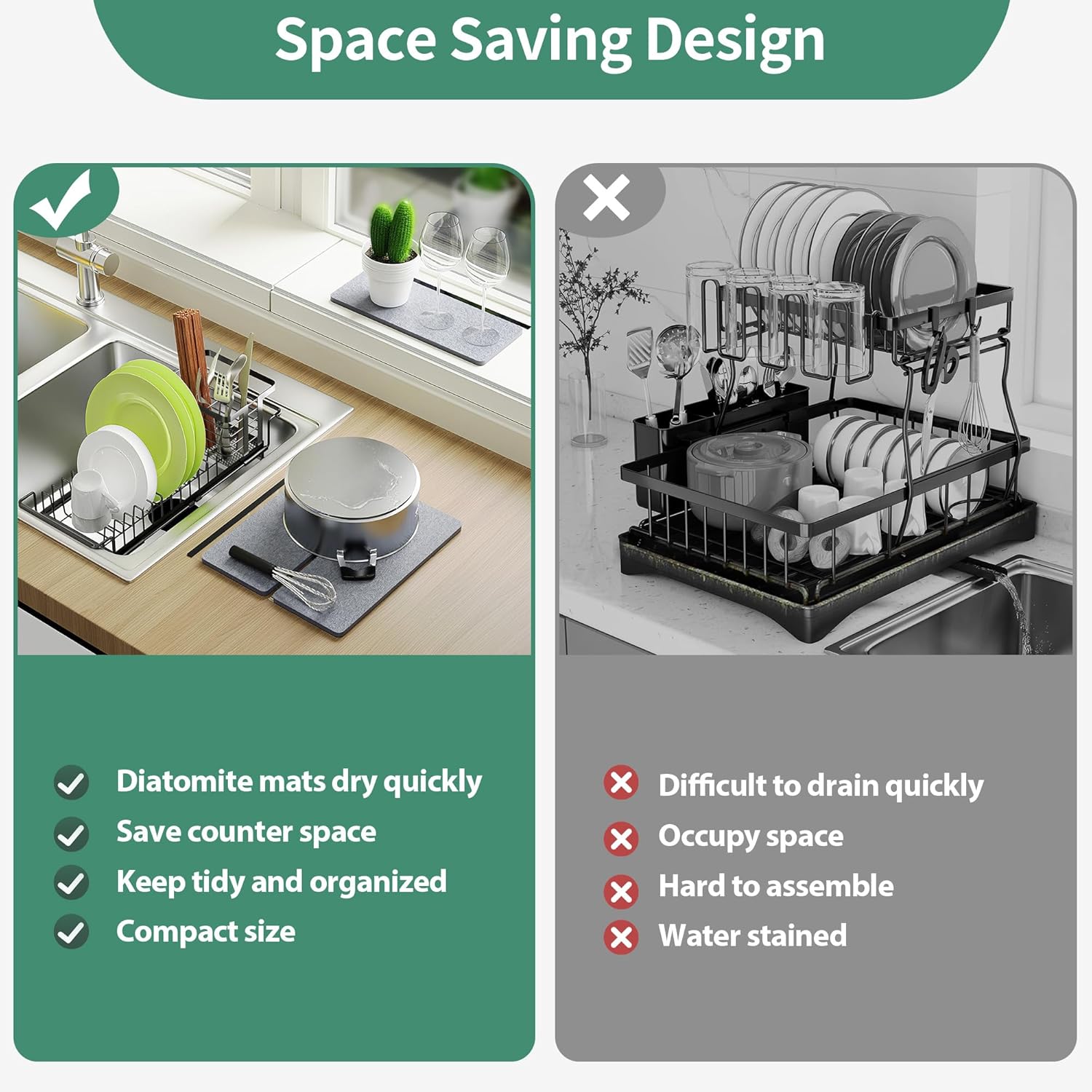 - Quickly Absorbs Water: The aesthetic dish drying rack and mat set includes 3 diatomite mats with super absorbent properties. The foldable dish drying mat is like a supercharged sponge that can quickly absorb moisture dripping from dishes in 60 seconds, keeping the countertop dry and tidy