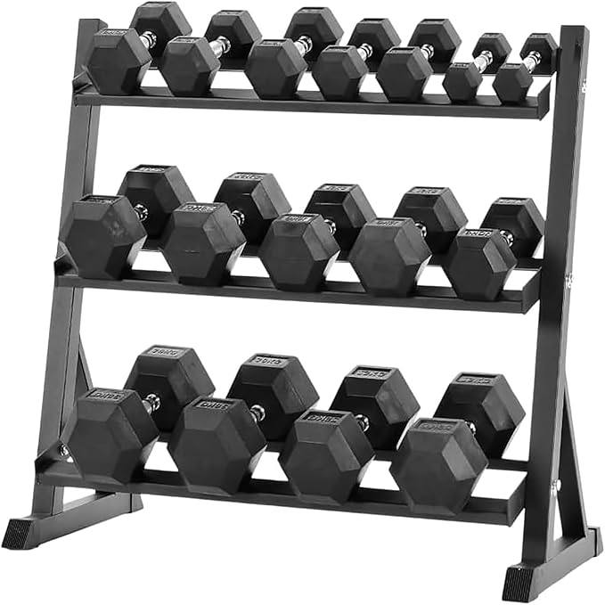 - 3. Space-Saving Design: The three-layer dumbbells rack design with hexagon-shaped ends keeps your dumbbells from rolling away while providing a convenient and spacious storage solution. The anti-slip surface and angled design make it easy to grab your free weights and start your workout in seconds!