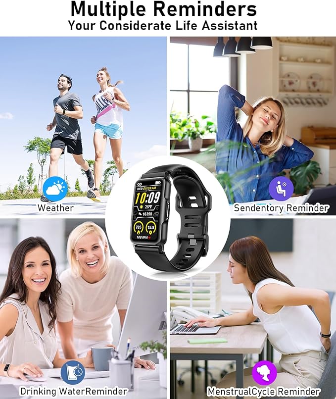 - 【Your Convenient Life Assistant】The versatile design of the blood pressure watch for women and men provide you more features including real-time whether display, sedentary reminder, drinking water reminder, menstrual cycle reminder, remote camerall shooting, making it a convenient assitant in your life. There are 12-hour or 24-hour time display format options and ℉/℃ options, set one style that fits your routines mostly.