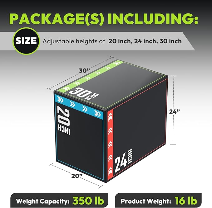 - 3-IN-1 ADJUSTABLE HEIGHTS: This plyometric jump box offers 20”, 24”, and 30” heights—just rotate it to switch instantly. Beginners can start with steady step-ups on the 20” setting, intermediates can crank up intensity with 24” box jumps, and advanced users can push limits with 30” explosive reps. One jump box, endless ways to progress.