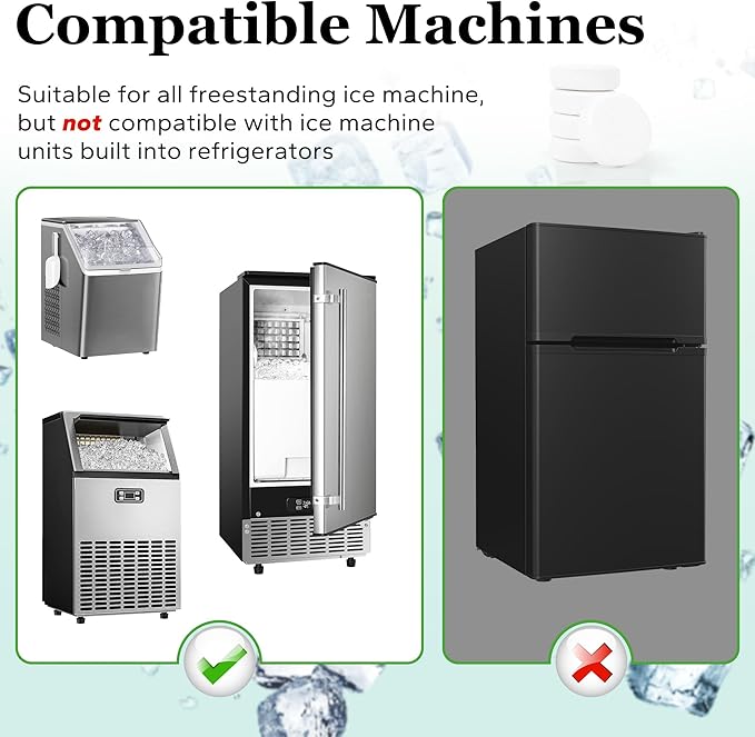 - βοΈSafe for Designed for Countertop, Portable, and Commercia Ice Makers: Formulated to be completely safe for use in all popular residential and commercial automatic ice makers . Protect your appliance from damage caused by hard water and ensures your ice tastes fresh and pure.