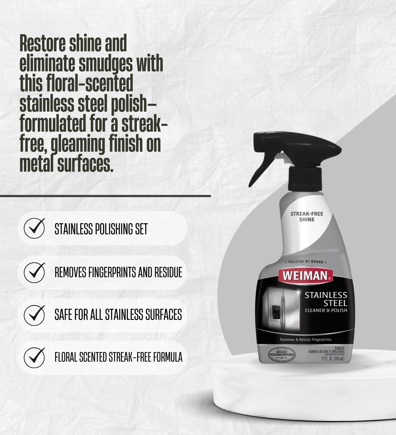 - πππππ‘ππ‘π ππ¦π¦ππ‘π§ππππ¦ π¦ππ§ β This gift set includes 3x Weiman Floral Scent Stainless Steel Cleaner & Polish 12 oz Liquid bundle with 1x microfiber cloth, cleans stainless steel appliances and surfaces. (Packaging May Vary)