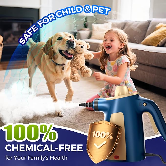 - 【Chemical-Free & Eco-Friendly】Say goodbye to harsh chemicals! Our steam cleaner for home relies solely onpure, high-pressure steam—no chemical additives needed. It physically lifts away stains and dirt, for a deeper clean, offering a completely eco-friendly cleaning experience. This ensures a safe and healthy living environment for you and your family. Ideal for households with children and pets, to chemical products, it leaves no harmful residues behind on surfaces