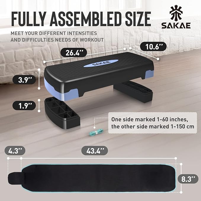 - All-in-One Exercise Set: Step platform features a diamond-textured surface for secure grip; four non-slip feet add stability and prevent floor scratches; set includes one blue black stepper, 43.4” W x 8.3” D waist trimmer, and one measuring tape