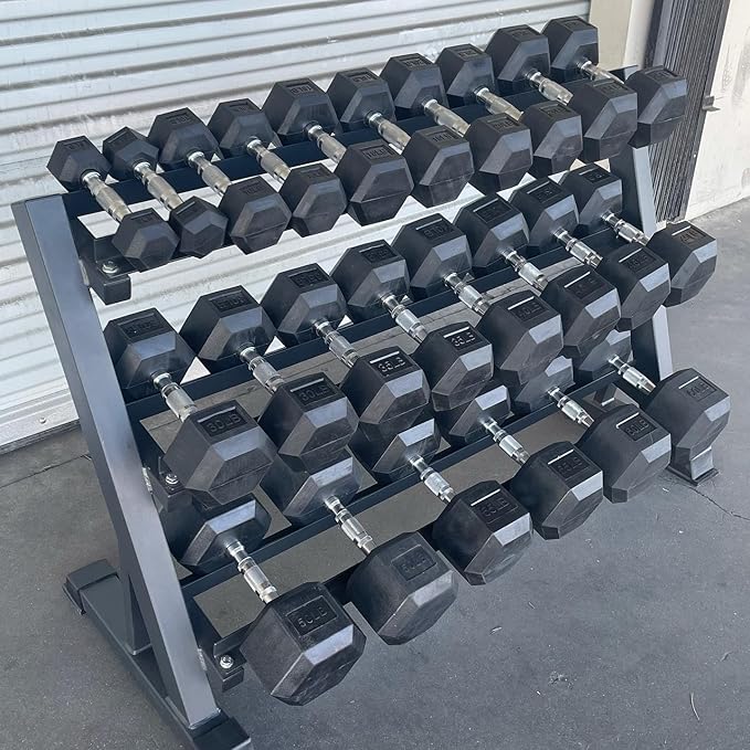 - 3. Space-Saving 3-Tier Dumbbell Rack for Organized Workouts The sturdy weight rack with dumbbells set features a compact three-tier design, keeping weights secure and easily accessible. The anti-slip, angled shelves prevent tipping, saving space while making workouts hassle-free.