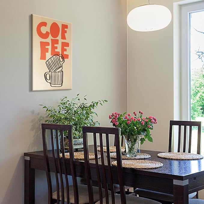 - This retro poster features a large, thick orange "COFFEE" letter as its core, and is eye-catching on a neutral background. Paired with two stacked hand painted striped coffee cups, it is both fun and quirky. A must have for coffee enthusiasts, injecting vitality into any space such as kitchens, cafes, and home offices. Perfect integration with retro, bohemian, or modern minimalist styles will bring classic and nostalgic feelings to the decoration.