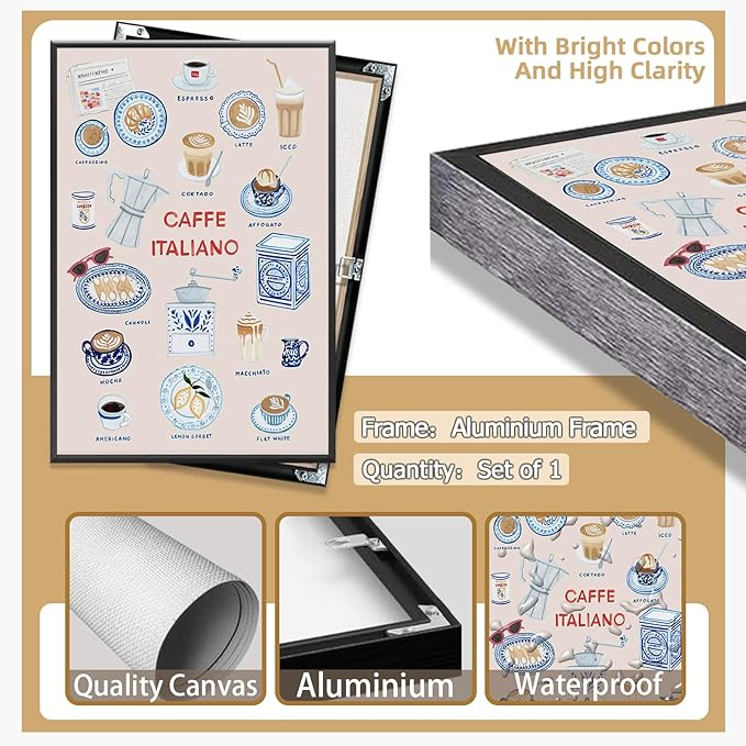 - This vibrant Italian coffee poster showcases a range of iconic Italian coffee drinks, traditional brewing tools, and classic cuisine. Very suitable for coffee enthusiasts and Italian culture fans, like a mini guide to Italian cafe life, bringing the charm of Roman cafe directly to your wall. Whether you are decorating the kitchen, dining room, or coffee corner, you can add the authentic charm of 'La Dolce Vita'.