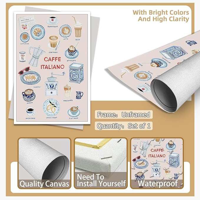 - This vibrant Italian coffee poster showcases a range of iconic Italian coffee drinks, traditional brewing tools, and classic cuisine. Very suitable for coffee enthusiasts and Italian culture fans, like a mini guide to Italian cafe life, bringing the charm of Roman cafe directly to your wall. Whether you are decorating the kitchen, dining room, or coffee corner, you can add the authentic charm of 'La Dolce Vita'.