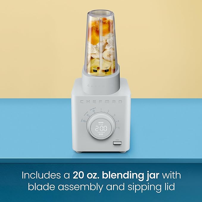 - INTUITIVE CONTROLS: The dial control panel includes 5 blending speeds and a pulse option to finetune your blending. Presets include a countdown timer and LED alerts notify you when you need to “Fix Jar” or “Add Liquid.”
