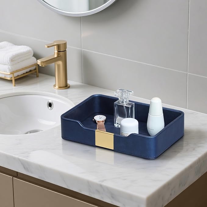 PU Leather Valet Tray with Gold Accent, Decorative Nightstand Organizer Desk Trays Cologne Organizer for Men - Key Bowl Vanity Trinket Tray for Dresser Bedside Entryway Table (Navy Blue)